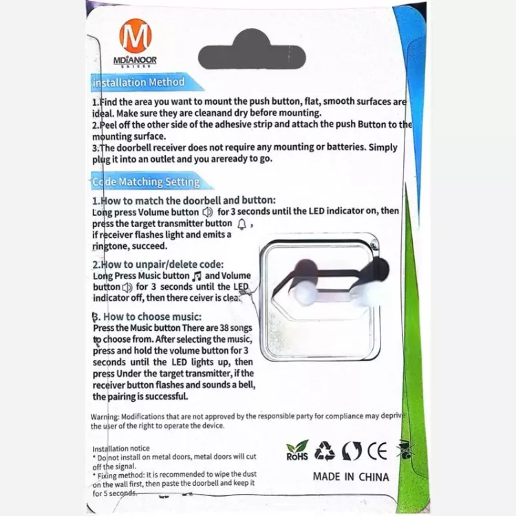 روش نصب: 1. ناحیه ای را که می خواهید دکمه فشاری را نصب کنید پیدا کنید، سطوح صافی که ایده آل هستند. قبل از نصب از تمیز و خشک بودن آنها اطمینان حاصل کنید. 2. طرف دیگر نوار چسب را جدا کرده و دکمه فشاری را به سطح نصب آن وصل کنید. 3. گیرنده زنگ در نیازی به نصب یا باتری ندارد. به سادگی آن را به پریز وصل کنید و آماده میشود. تنظیم تطبیق کد : 1. چگونه زنگ در و دکمه را مطابقت دهیم: دکمه ولوم () را به مدت 3 ثانیه فشار دهید تا نشانگر LED روشن شود، سپس دکمه فرستنده هدف را فشار دهید اگر گیرنده نور چشمک می زند و آهنگ زنگ منتشر می کند، موفق می شوید. 2. نحوه لغو جفت/حذف کد: دکمه موسیقی و دکمه صدا را به مدت 3 ثانیه فشار دهید تا نشانگر LED خاموش شود، سپس گیرنده روشن شود. 3. نحوه انتخاب موسیقی: دکمه موسیقی را فشار دهید 38 مورد برای انتخاب وجود دارد. پس از انتخاب موسیقی، دکمه صدا را به مدت 3 ثانیه فشار دهید و نگه دارید تا LED روشن شود، سپس زیر فرستنده هدف را فشار دهید، اگر دکمه گیرنده چشمک می زند و زنگ به صدا در می آید، جفت شدن موفقیت آمیز است.